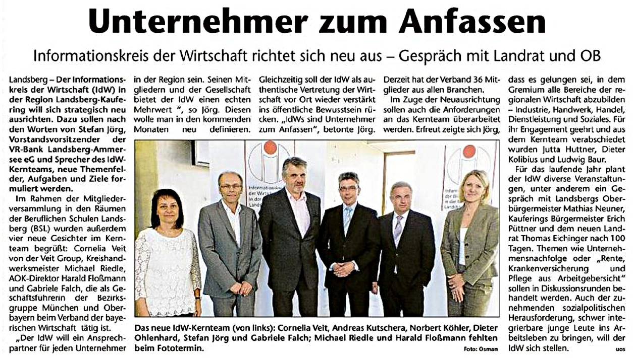 In den Beruflichen Schulen in Landsberg fand die diesjährige Mitgliederversammlung des IdW statt. Wichtigster Punkt war dabei die Neuaufstellung des Kernteams. Gleich vier neue Gesichter wurden dabei in das Kernteam des Informationskreises der Wirtschaft berufen: Gabriele Falch (vbw), Cornelia Veit (Veit GmbH), Michael Riedle (KHS Landsberg) und Harald Floßmann (AOK Landsberg).